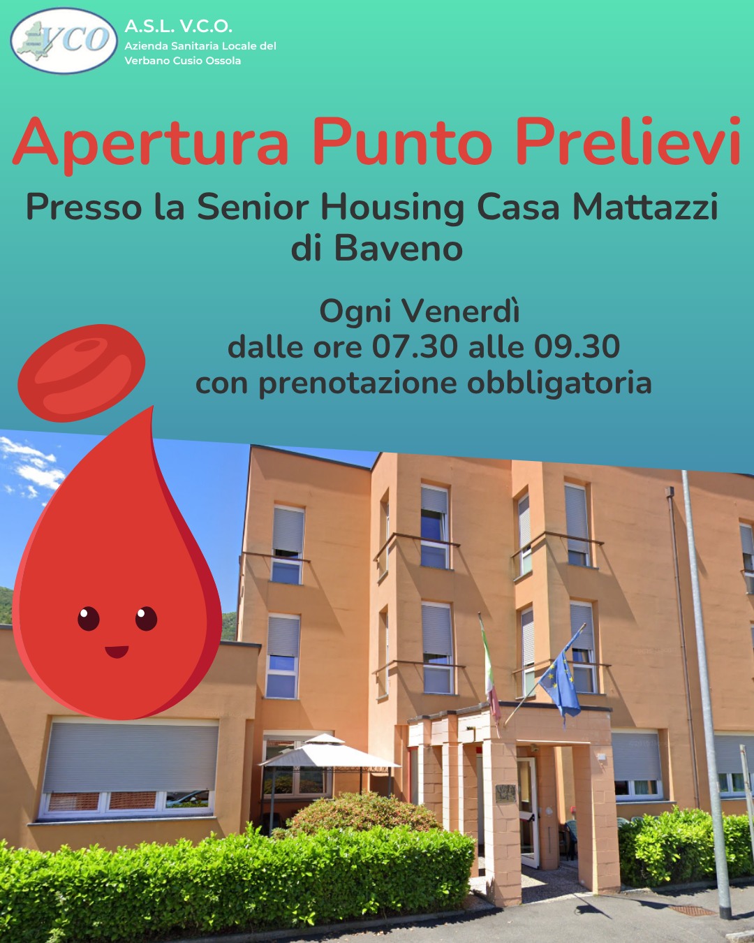 Per tutti i cittadini residenti a Baveno è attivo il punto prelievi presso la Senior Housing Casa Mattazzi in via 17 Martiri 33/A – ingresso retro stabile.