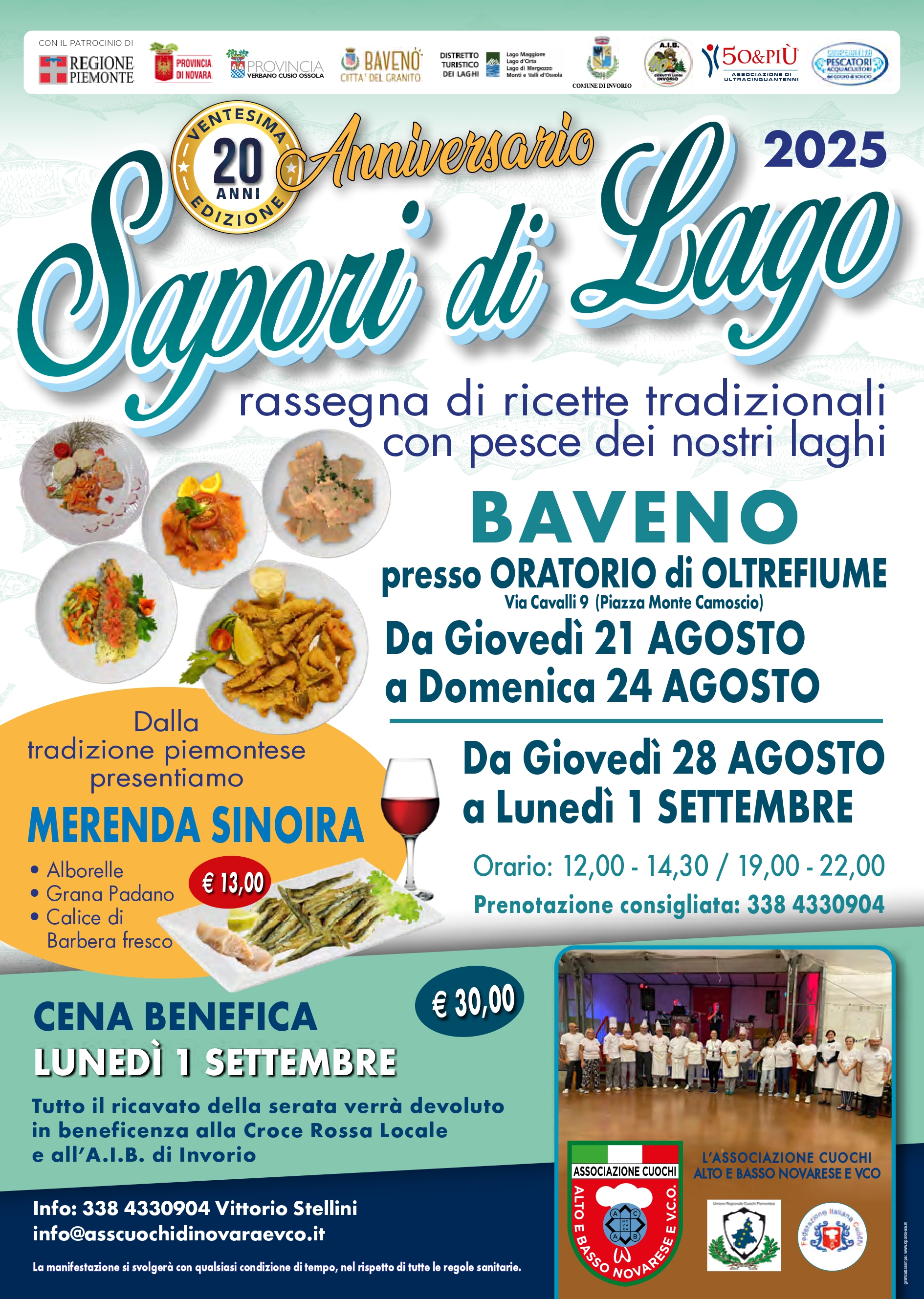 Dal 21 al 24 agosto e dal 28 agosto al 1 settembre SAPORI DI LAGO, manifestazione culinaria giunta alla 20° edizione, vi aspetta presso l'Oratorio di Oltrefiume.