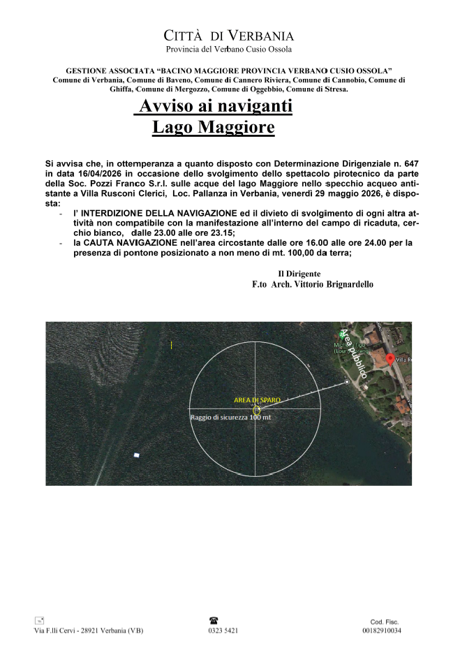 Si avvisa che con determinazione dirigenziale 647 del 16.04.2026 in occasione dello svolgimento dello spettacolo pirotecnico da parte della Soc. Pozzi Franco S.R.L sulle acque del lago maggiore nello specchio acqueo antistante a Villa Rusconti Clerici, Loc. Pallanza in Verbania, VENERDì 29/05/2026 è disposta: