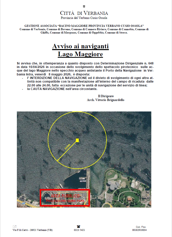 Si avvisa che con determinazione dirigenziale 648 del 16.04.2026 in occasione dello svolgimento dello spettacolo pirotecnico sulle acque del lago Maggiore nello specchio acqueo antistante il Porto della Navigazione in Verbania Intra, venerdì 8 maggio 2026, è disposta: