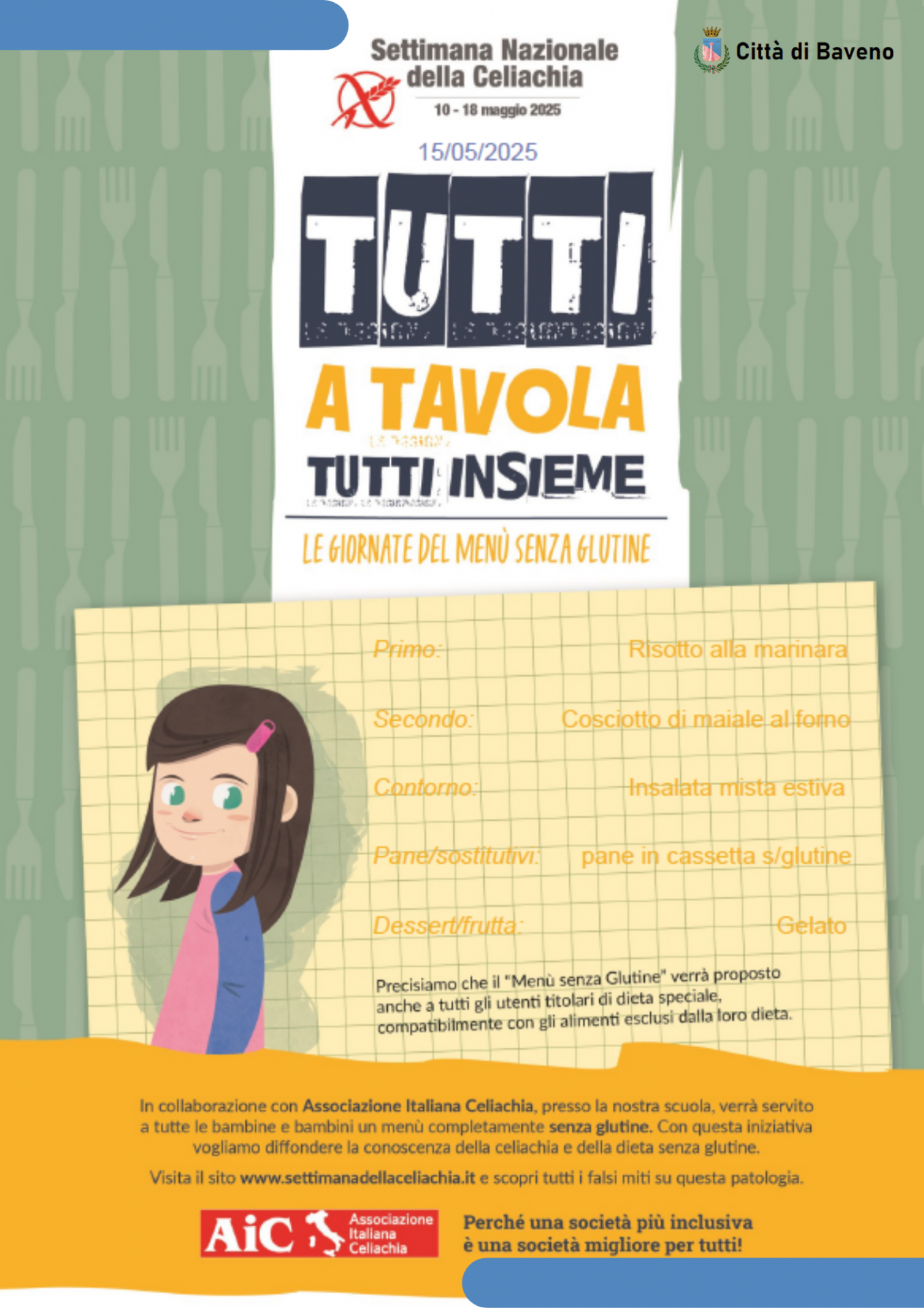 Dal 10 al 18 maggio 2025 ricorre la Settimana della Celiachia, un evento per divulgare e sensibilizzare la corretta informazione sulla celiachia e sulla dieta senza glutine. Tra le iniziative che saranno organizzate quella di “Tutti a tavola, tutti insieme: le giornate del menu senza glutine”, che prevede il coinvolgimento delle mense nelle scuole dell’infanzia e primaria con l’organizzazione di un pasto senza glutine.