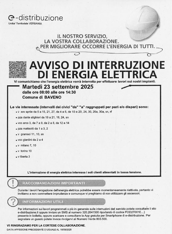 Enel distribuzione segnala che l'energia elettrica verrà interrotta per lavori sui nostri impianti nella giornata di martedì 23 settembre 2025 , dalle ore 08:00 alle ore 14:30 nel comune di BAVENO nelle seguenti vie e piazze: