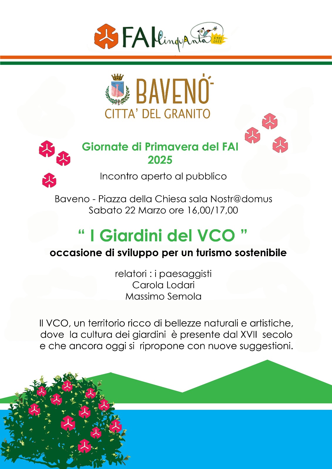 - Incontro aperto al pubblico: i Giardini del VCO, occasione di sviluppo per un turismo sostenibile. Relatori i paesaggisti Carola Lodari e Massimo Semola. Sabato 22 marzo ore 16:00, sala nostr@domus piazza della Chiesa Baveno.