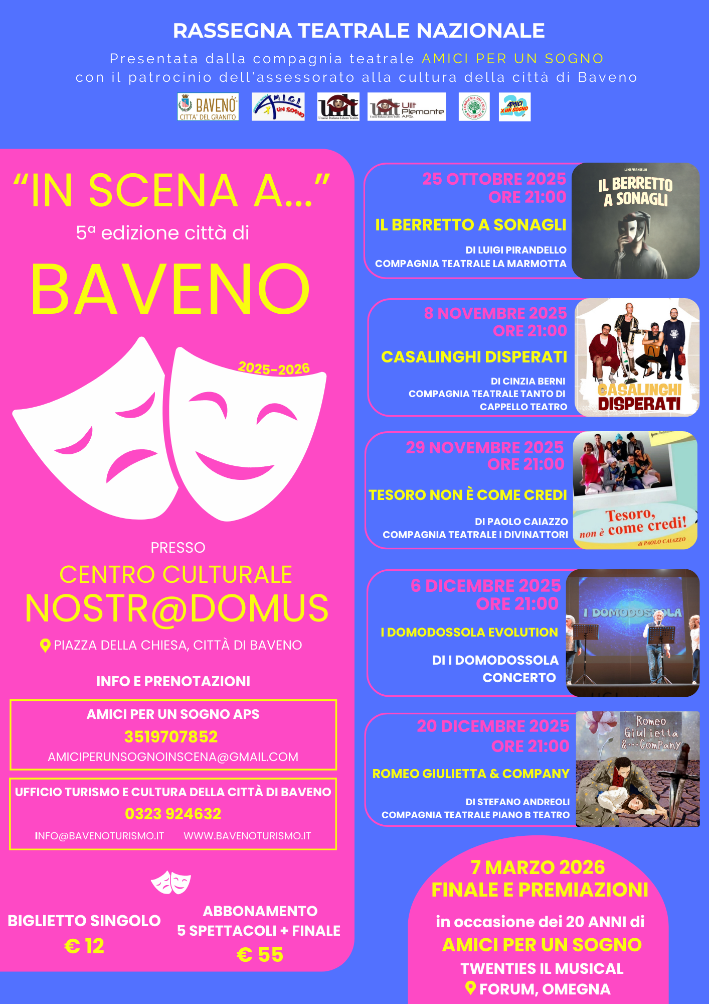 Torna per la quinta stagione la rassegna teatrale nazionale "In scena a...Baveno" con cinque appuntamenti con il teatro (commedia brillante, musicale e prosa) presso il Centro Culturale Nostr@domus.