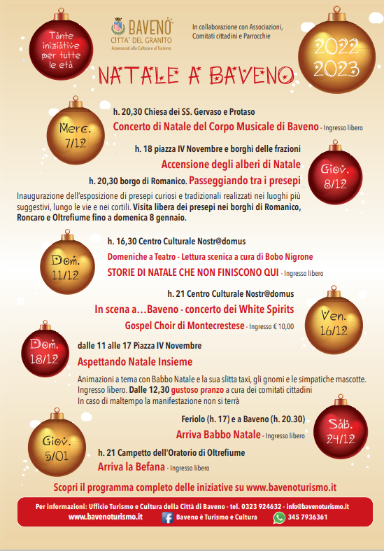 La tradizione si rinnova il 24 dicembre: Babbo Natale raggiungerà il lungolago di Feriolo nel pomeriggio e, alle 20:30, sul burchiello dei pescatori arriverà dall’Isola Superiore in piazza IV Novembre a Baveno per regalare ai presenti tante caramelle, prima di visitare l’ultimo nato della città. Il 5 gennaio alle 21:00 non mancherà ad Oltrefiume la simpatica Befana con le sue calze ricche di dolcezze per tutti i presenti.